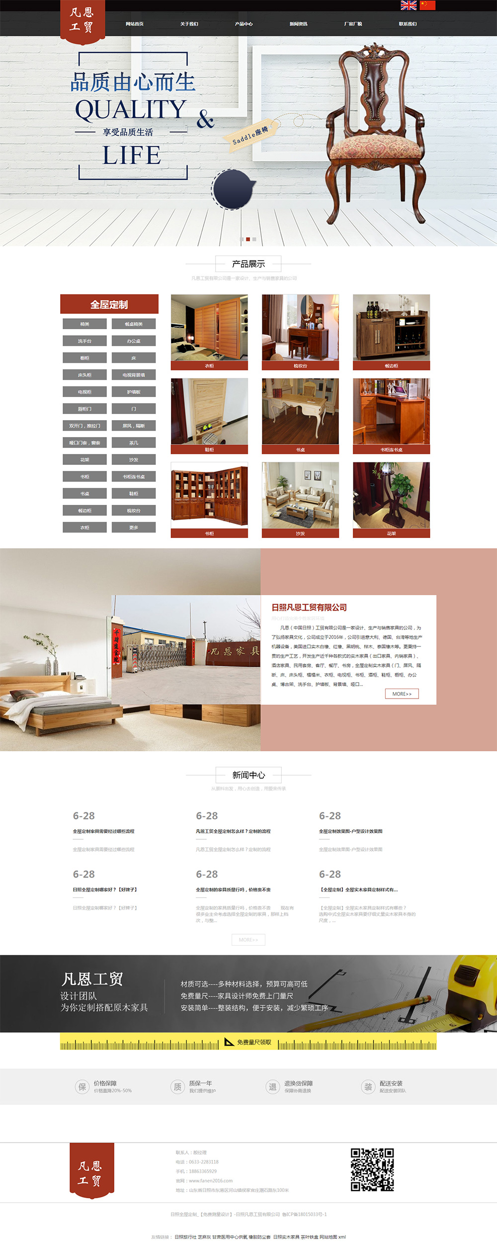 • 凡恩(中國日照)工貿有限公司是一家設計、生產(chǎn)與銷售家具的公司,為了弘揚家具文化,公司成立于2016年,公司引進意大利、德國、臺灣等地生產(chǎn)機器設備,美國進口實木白橡、紅橡、黑胡桃、櫸木、泰國橡木等。更秉持一貫的生產(chǎn)工藝,開發(fā)生產(chǎn)近千種各款式的實木家具(出口家具、內銷家具)、酒店家具、民用套房、客廳、餐廳、書房,全屋定制實木家具(門、屏風、隔斷、床、床頭柜、榻榻米、衣柜、電視柜、書柜、酒柜、鞋柜、櫥柜、辦公桌、博古架、洗手臺、護墻板、背景墻、啞口套、餐桌、餐椅、沙發(fā)、茶幾、花架)等產(chǎn)品:以質量好、款式多、價格