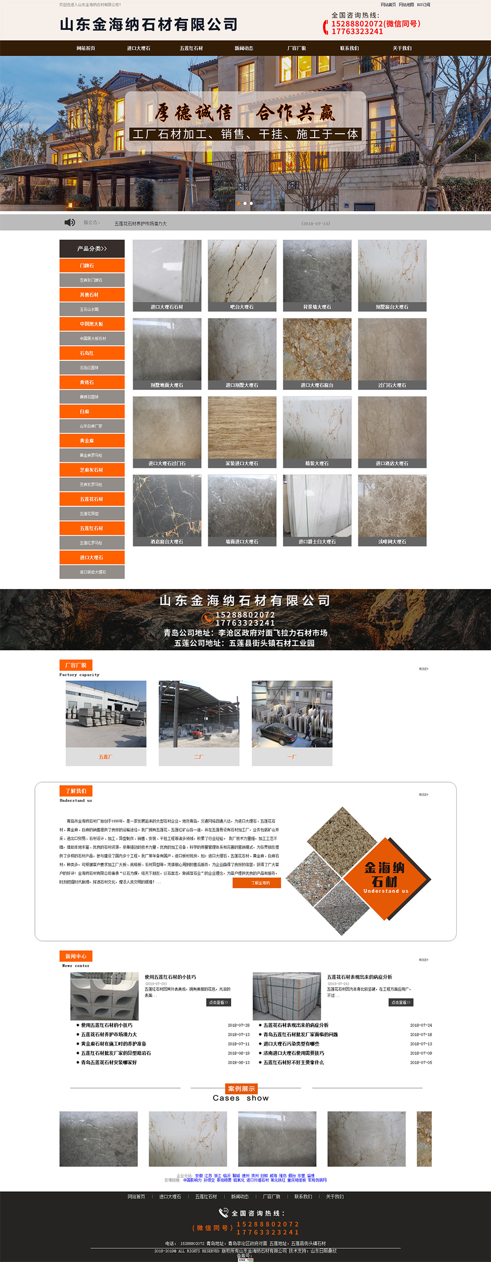 • 青島市金海納石材廠始 創(chuàng)于1998年,是一家發(fā)展起來的大型石材企業(yè)。地處青島,交通網(wǎng)絡四通八達,為進 口大理石、五蓮花石材、黃金麻、白麻的銷售提供了良好的運輸途徑。我廠擁 有五蓮花、五蓮紅礦山各一座,并在五蓮縣設有石材加工廠,業(yè)務包括礦山開采、進出口貿(mào)易、石材設計、加工、異型制作、銷售、安裝、干掛工程等諸多領域,積累了行業(yè)經(jīng)驗。 我廠技 術力量強,加工工藝不錯,借助本地優(yōu)良的石材資源,依靠強勁的技 術力量、優(yōu)良的加工設備、科學的質量管理體系和完善的營銷模式,為各界朋友提供了多樣的石材產(chǎn)品,參與建設了國
